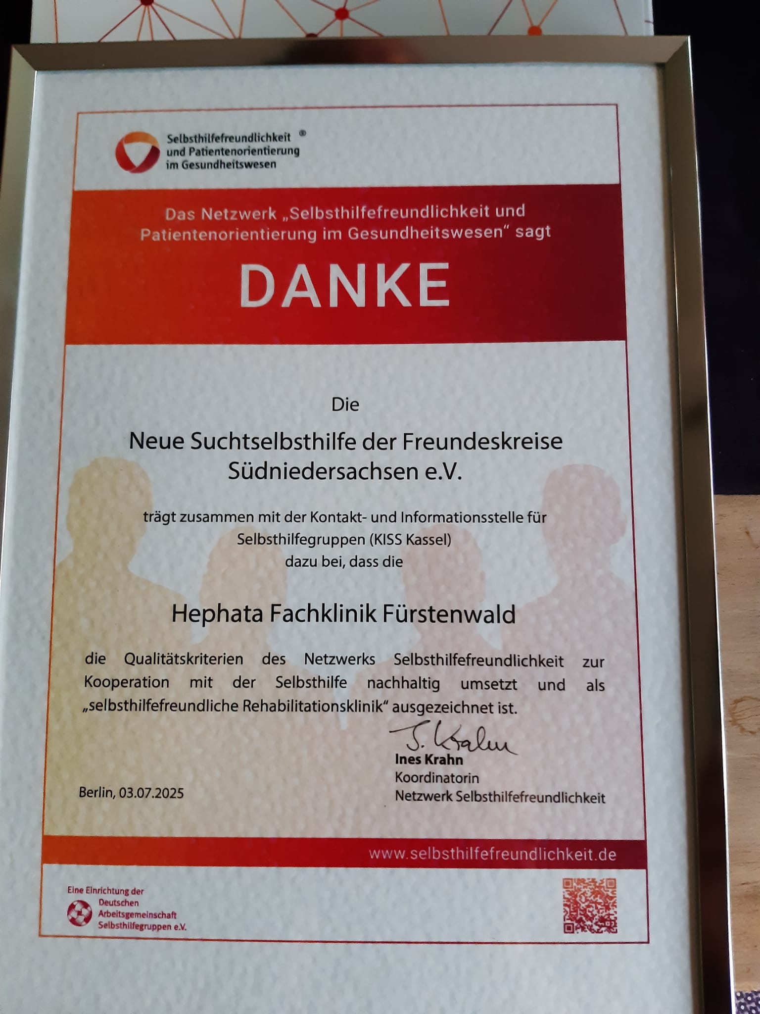 Auszeichnung „Selbsthilfefreundliche Rehabilitationsklinik“ vom Netzwerk SPiG